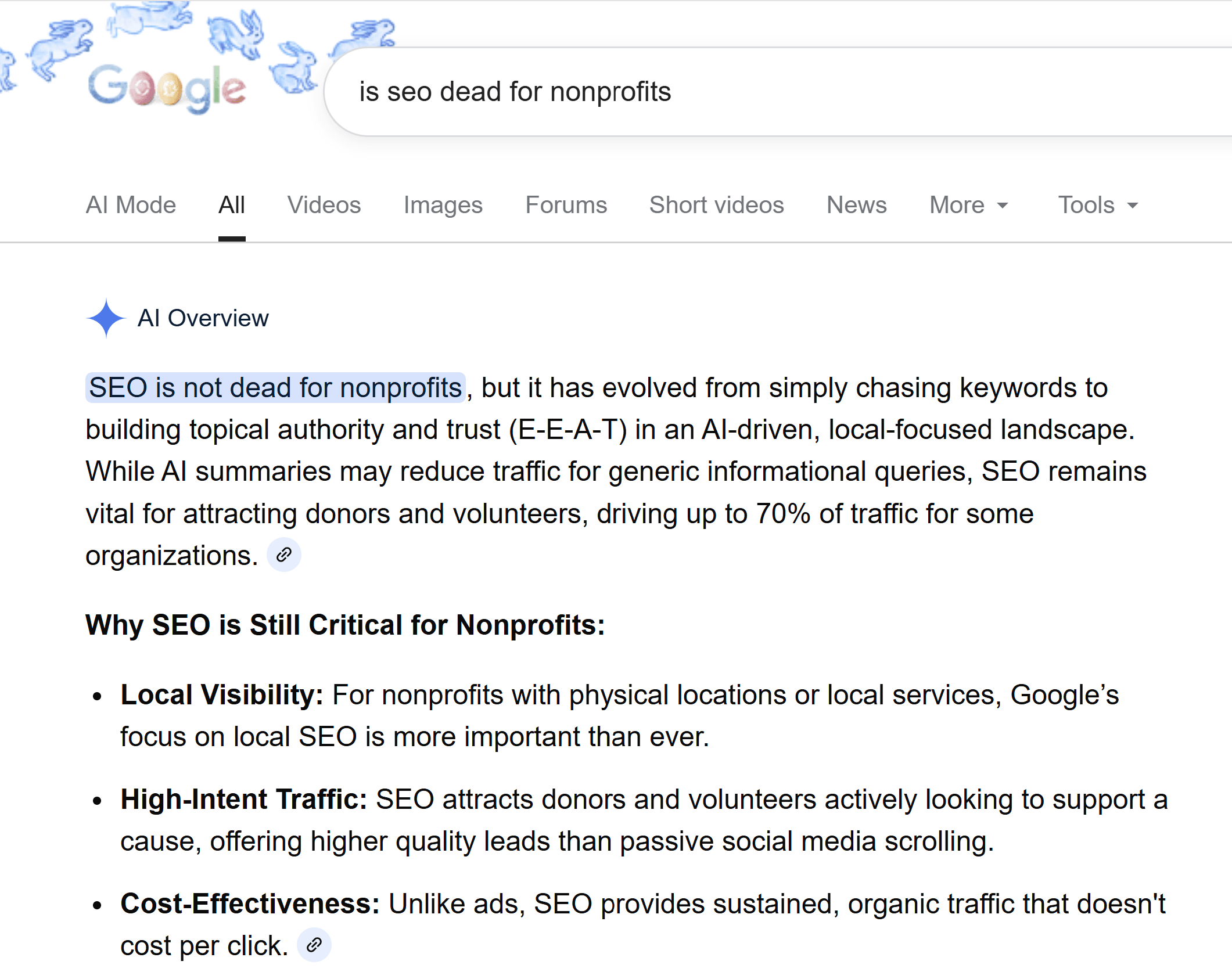 The search landscape is changing, but by no means is SEO dead for Nonprofits in my experience and according to Google's AI Overview on the subject, good SEO is still critical for Nonprofits.